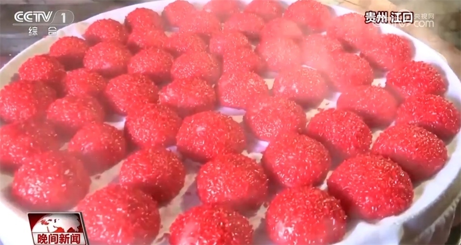 年貨寄托了人們對來年的美好期盼。貴州銅仁江口縣的“紅粑粑”寓意幸福美滿,每年春節(jié)前,當(dāng)?shù)厝硕紩R聚一堂,制作圓圓的“紅粑粑”等待過年的到來。