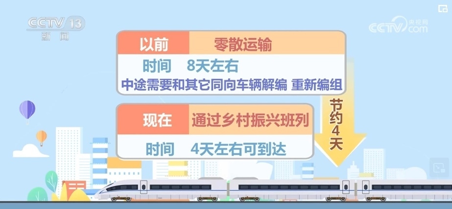 路上耗時(shí),以前零散運(yùn)輸需要8天左右,中途需要和其他同向車(chē)輛解編、重新編組,現(xiàn)在通過(guò)鄉(xiāng)村振興班列4天左右可以到達(dá),這就節(jié)約了4天時(shí)間。