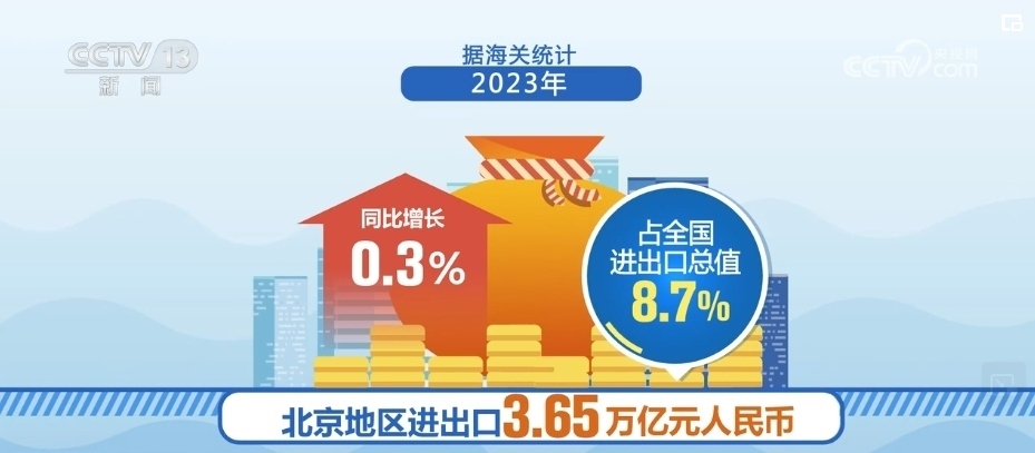 據(jù)海關統(tǒng)計,2023年,北京地區(qū)進出口3.65萬億元人民幣,同比增長0.3%,占全國進出口總值的8.7%。