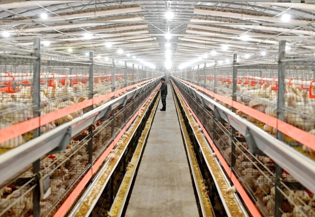 ?2023年12月16日,河北省灤州市灤城街道辦事處楊家院村一家肉雞養(yǎng)殖合作社的社員在雞舍內工作。 新華社記者楊世堯攝