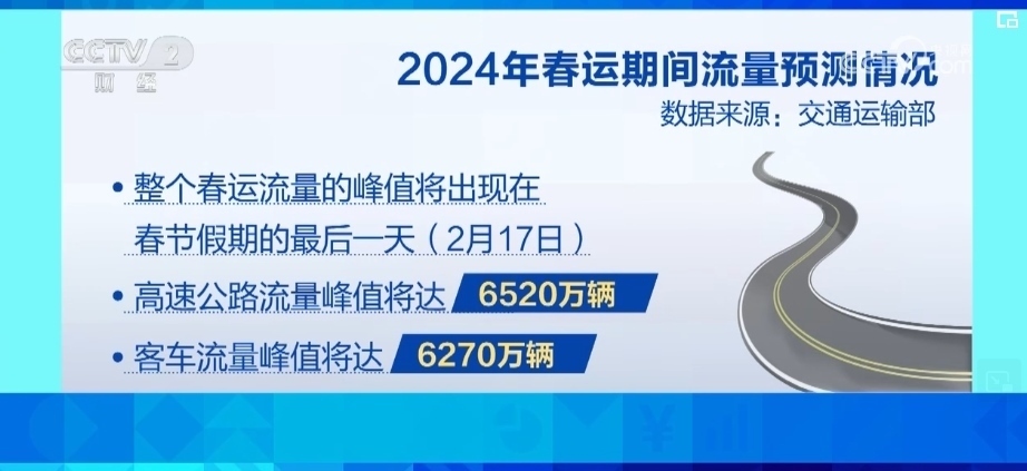 交通運輸部預(yù)計,2024年春運期間,全國公路網(wǎng)日均流量將達(dá)3720萬輛,比2023年同期增長7.5%。整個春運流量的峰值將出現(xiàn)在春節(jié)假期的最后一天,也就是2月17日,高速公路流量峰值將達(dá)6520萬輛,客車流量峰值將達(dá)6270萬輛。