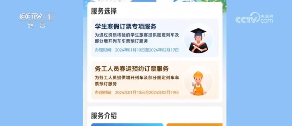 今年春運(yùn),鐵路部門推出預(yù)約購票和預(yù)填購票兩項購票新方式,預(yù)約購票功能專門針對學(xué)生和務(wù)工人員。符合條件的學(xué)生旅客(已通過學(xué)生優(yōu)惠資質(zhì)核驗且有剩余優(yōu)惠乘車次數(shù))可通過“學(xué)生寒假訂票專項服務(wù)”專區(qū)預(yù)約購買春運(yùn)期間的火車票。已通過實名制核驗的務(wù)工人員可通過“務(wù)工人員春運(yùn)預(yù)約訂票服務(wù)”專區(qū)預(yù)約購買春運(yùn)期間火車票。