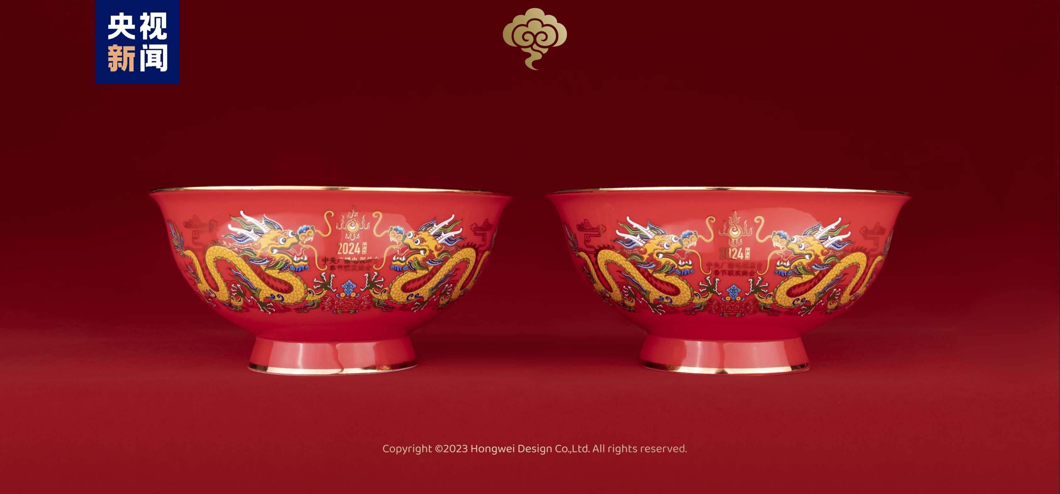 總臺文創(chuàng)的龍碗主畫面取自中國民間吉祥裝飾圖案“雙龍戲珠”,采用對稱型構圖,寓意富貴吉祥,幸福安康。龍碗色彩鮮艷明快,烘托出民間新年的喜慶氛圍。
