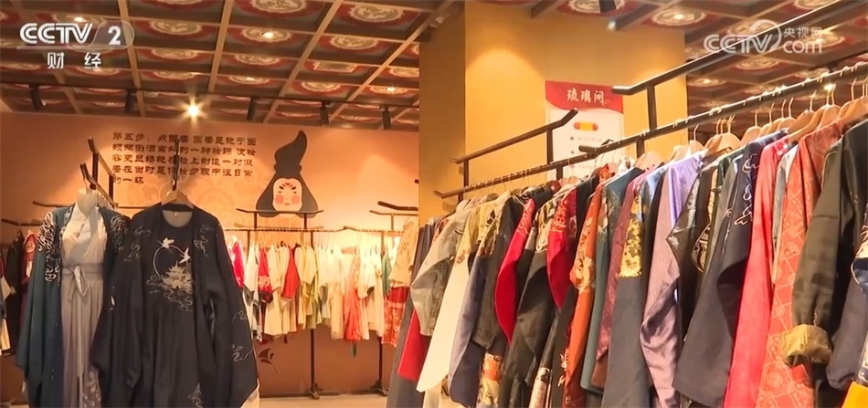 總臺(tái)記者 秦祎:我旁邊的這件就是店內(nèi)最受歡迎的唐裝之一——花想容,這件衣服里面是一件唐裝的基礎(chǔ)款造型齊胸襦裙,披上外披則是貴妃造型,如果擔(dān)心天氣冷可以像我一樣加上斗篷。