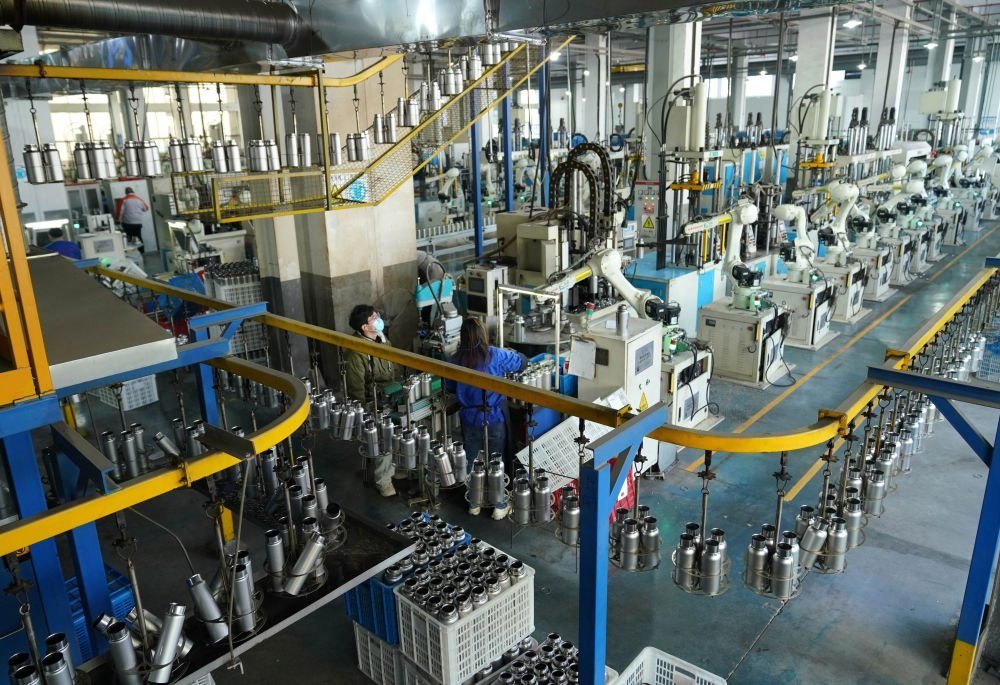 這是2023年12月21日在浙江省永康市一家保溫杯生產(chǎn)企業(yè)拍攝的自動化生產(chǎn)流水線。新華社記者 韓傳號 攝