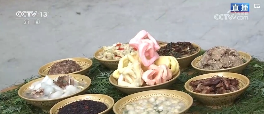 傳統(tǒng)“八大碗”,葷素搭配、香味撲鼻。這個(gè)菜叫做麻脆,是村民們過(guò)年的時(shí)候一定要吃上的美味。麻脆由糯米制作而成,不僅有不同的顏色,還可以制作成花鳥(niǎo)魚(yú)蟲(chóng)、蔬菜水果等多種圖案。龍年到來(lái),村里還特別用蔬果做了一條中國(guó)龍。