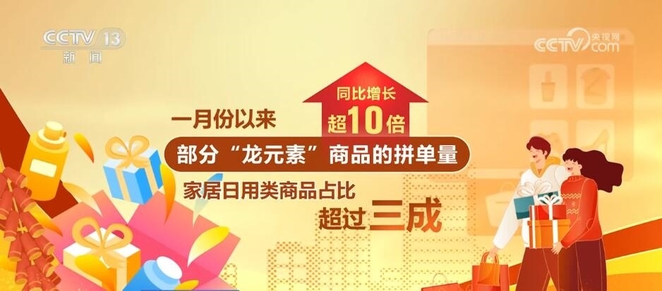 “龍?jiān)亍碑?dāng)仁不讓地成為今年春節(jié)的新“頂流”,不光有龍年的福字對(duì)聯(lián),還有龍年臺(tái)歷、龍寶寶毛絨玩具、龍年紅色內(nèi)衣、龍年中國(guó)結(jié)掛飾成為最熱銷(xiāo)的春節(jié)周邊商品前五名。1月份以來(lái),部分“龍?jiān)亍鄙唐返钠磫瘟客仍鲩L(zhǎng)超10倍,其中,家居日用類(lèi)商品占比超過(guò)三成。