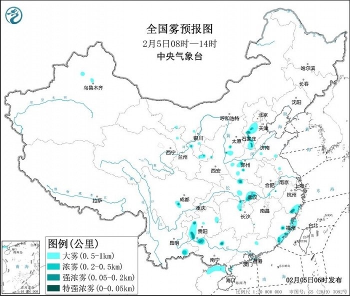中央氣象臺2月5日06時繼續(xù)發(fā)布大霧黃色預(yù)警