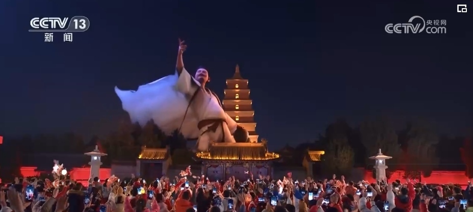 除夕當(dāng)晚9時(shí),西安分會(huì)場(chǎng)《山河詩長(zhǎng)安》篇章的“打開方式”讓人眼前一亮。在科技助力下,“詩仙”李白跨越歲月長(zhǎng)河“穿越”而來,在煙火璀璨中,隨著熙熙攘攘的人群一起走進(jìn)西安城墻永寧門,走入千年后的耀眼長(zhǎng)安。