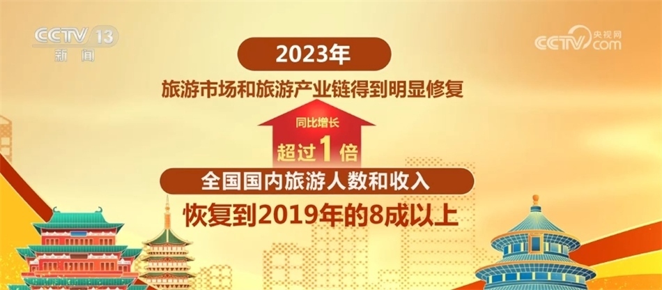 2023年,旅游市場和旅游產(chǎn)業(yè)鏈得到明顯修復,全國國內(nèi)旅游人數(shù)和收入同比增長超過1倍,恢復到2019年的8成以上;入出境旅游人數(shù)超過1.9億人次,較上一年增長2.8倍以上。