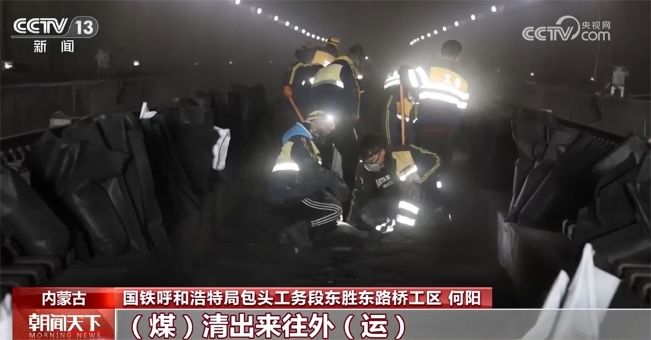 國(guó)鐵呼和浩特局包頭工務(wù)段東勝東路橋工區(qū) 何陽(yáng):這塊就已經(jīng)(堆)積得相當(dāng)厚了,咱們今天必須抓緊時(shí)間把這個(gè)清出來,煤清出來往外運(yùn),要不然后面影響貨車正常通行。