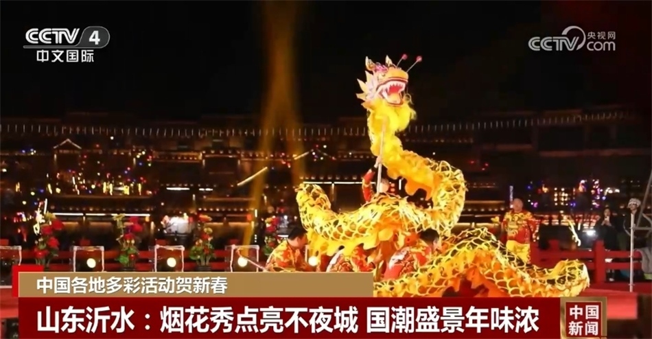 在山東沂水,穿越云端的煙花秀點(diǎn)亮了沂水彩虹不夜城的天空,喧天的鑼鼓、歡騰的舞龍、熱鬧的氣氛搭配著“有鳳來(lái)儀”“盛彩敦煌”等隨處可見的國(guó)潮盛景,仿佛讓人穿越千年。
