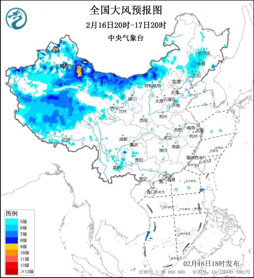 2月17日20時(shí)至18日20時(shí),新疆北疆東部和南疆盆地、內(nèi)蒙古西部、青海西南部、西藏西部、甘肅西部等地將有5~7級(jí)、陣風(fēng)8~9級(jí)的大風(fēng),新疆山口地區(qū)風(fēng)力可達(dá)10級(jí),陣風(fēng)12~13級(jí);黃海大部海域、東海北部海域?qū)⒂?級(jí)、陣風(fēng)8~9級(jí)的大風(fēng)。