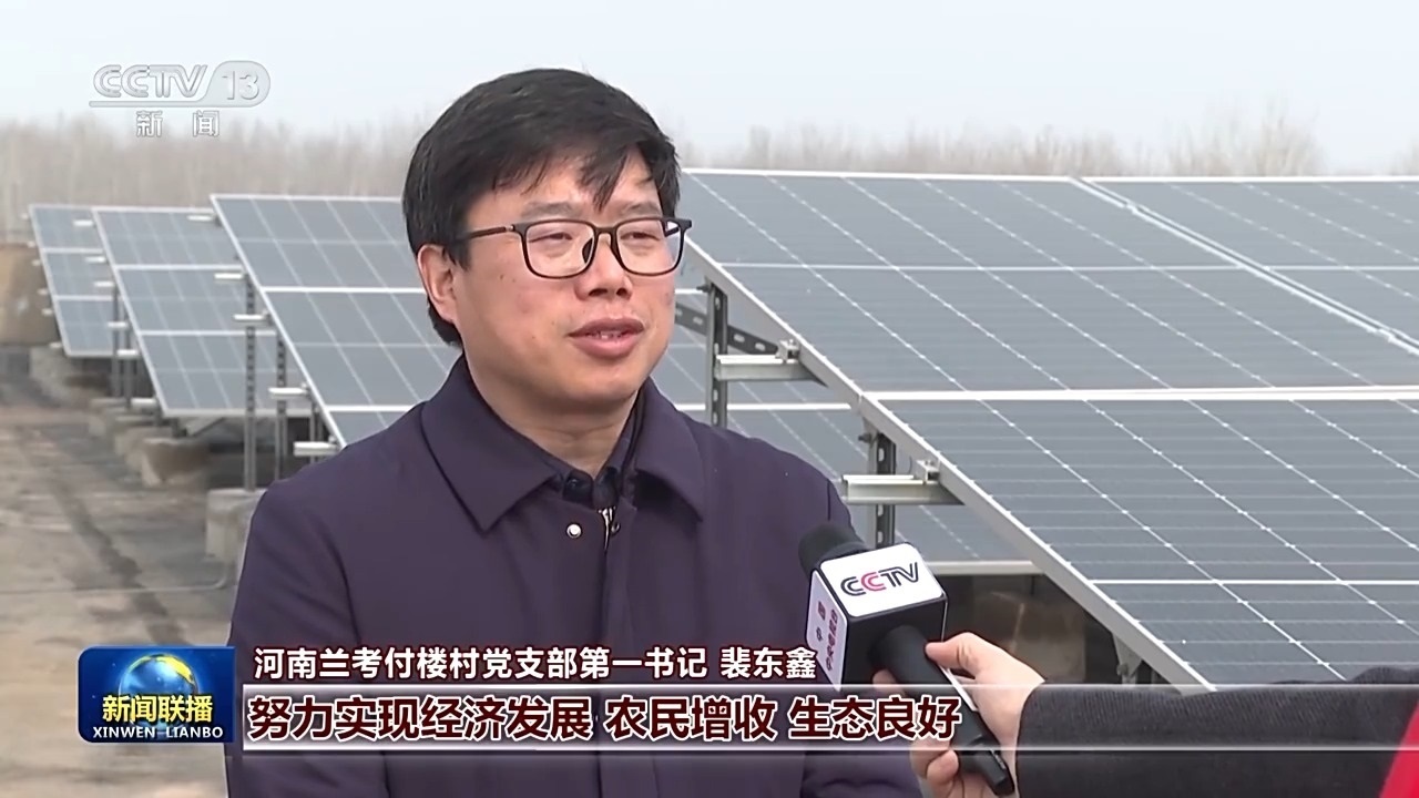河南蘭考付樓村黨支部第一書記 裴東鑫:習近平總書記要我們在綠色發(fā)展中,努力實現(xiàn)經(jīng)濟發(fā)展、農(nóng)民增收、生態(tài)良好。我們大力實施了整個村莊的零碳化改造?,F(xiàn)在我們全村年光伏發(fā)電量超過120萬度,完全滿足我們整個村子的用電需求,我們村集體一年增收十幾萬元。