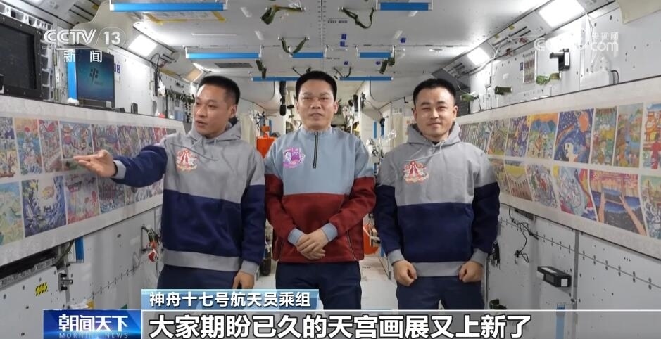 神舟十七號航天員乘組在鏡頭面前介紹“天宮畫展”時說:“全國各地的青少年朋友們,大家新年好!我們是神舟十七號航天員乘組,這里是咱們中國人自己的太空家園——中國空間站。分享一個好消息,大家期盼已久的天宮畫展又‘上新’了!”