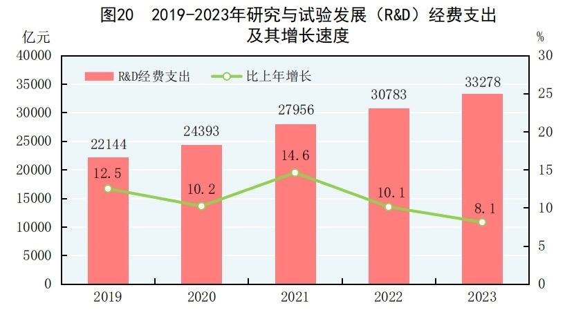 全年研究與試驗發(fā)展(R&D)經(jīng)費支出33278億元,比上年增長8.1%,與國內(nèi)生產(chǎn)總值之比為2.64%,其中基礎(chǔ)研究經(jīng)費2212億元,比上年增長9.3%,占R&D經(jīng)費支出比重為6.65%。國家自然科學(xué)基金共資助5.25萬個項目。截至年末,納入新序列管理的國家工程研究中心207個,國家企業(yè)技術(shù)中心1798家。國家科技成果轉(zhuǎn)化引導(dǎo)基金累計設(shè)立36只子基金,資金總規(guī)模624億元。國家級科技企業(yè)孵化器[64]1606家,國家備案眾創(chuàng)空間[65]2376家。全年授予發(fā)明專利權(quán)92.1萬件,比上年增長15.3%。PCT專利申請受理量[66]7.4萬件。截至年末,有效發(fā)明專利499.1萬件,比上年末增長18.5%。每萬人口高價值發(fā)明專利擁有量[67]11.8件。全年商標(biāo)注冊438.3萬件,比上年下降29.0%。全年共簽訂技術(shù)合同95萬項,技術(shù)合同成交金額61476億元,比上年增長28.6%。我國公民具備科學(xué)素質(zhì)[68]的比例達(dá)到14.14%。
