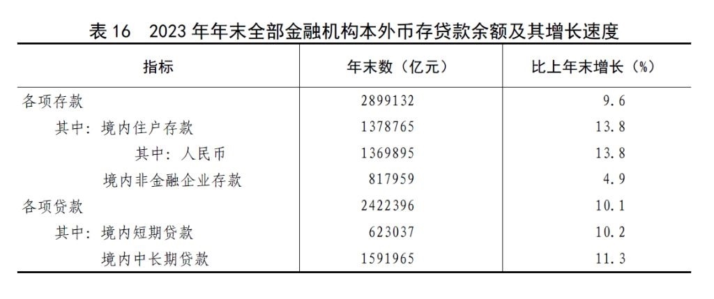 全年社會融資規(guī)模增量[48]35.6萬億元,按可比口徑計算,比上年多3.4萬億元。年末社會融資規(guī)模存量[49]378.1萬億元,按可比口徑計算,比上年末增長9.5%,其中對實體經(jīng)濟(jì)發(fā)放的人民幣貸款余額235.5萬億元,增長10.4%。年末全部金融機(jī)構(gòu)本外幣各項存款余額289.9萬億元,比年初增加25.4萬億元,其中人民幣各項存款余額284.3萬億元,增加25.7萬億元。全部金融機(jī)構(gòu)本外幣各項貸款余額242.2萬億元,增加22.2萬億元,其中人民幣各項貸款余額237.6萬億元,增加22.7萬億元。人民幣普惠小微貸款[50]余額29.4萬億元,增加5.6萬億元。人民幣制造業(yè)中長期貸款余額12.2萬億元,增加3.1萬億元。