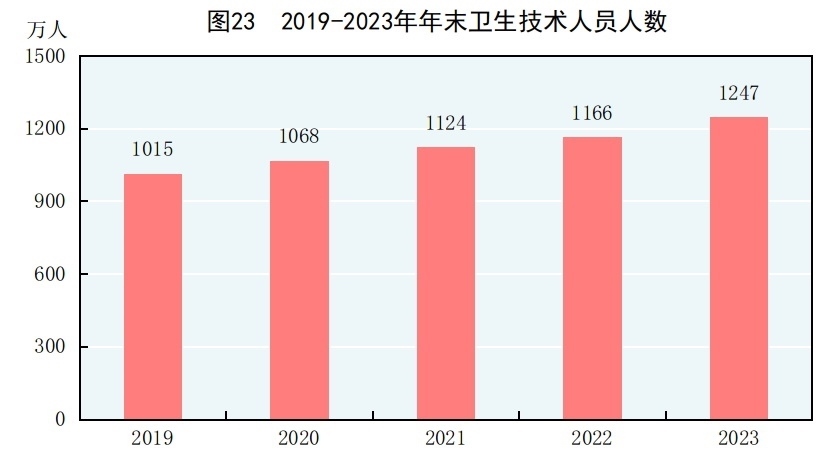 年末全國共有醫(yī)療衛(wèi)生機(jī)構(gòu)107.1萬個,其中醫(yī)院3.9萬個,在醫(yī)院中有公立醫(yī)院1.2萬個,民營醫(yī)院2.7萬個;基層醫(yī)療衛(wèi)生機(jī)構(gòu)101.6萬個,其中鄉(xiāng)鎮(zhèn)衛(wèi)生院3.4萬個,社區(qū)衛(wèi)生服務(wù)中心(站)3.7萬個,門診部(所)36.2萬個,村衛(wèi)生室58.3萬個;專業(yè)公共衛(wèi)生機(jī)構(gòu)1.2萬個,其中疾病預(yù)防控制中心3426個,衛(wèi)生監(jiān)督所(中心)2791個。衛(wèi)生技術(shù)人員1247萬人,其中執(zhí)業(yè)醫(yī)師和執(zhí)業(yè)助理醫(yī)師478萬人,注冊護(hù)士563萬人。醫(yī)療衛(wèi)生機(jī)構(gòu)床位1020萬張,其中醫(yī)院800萬張,鄉(xiāng)鎮(zhèn)衛(wèi)生院151萬張。全年總診療人次[75]95.6億人次,出院人次[76]3.0億人次。