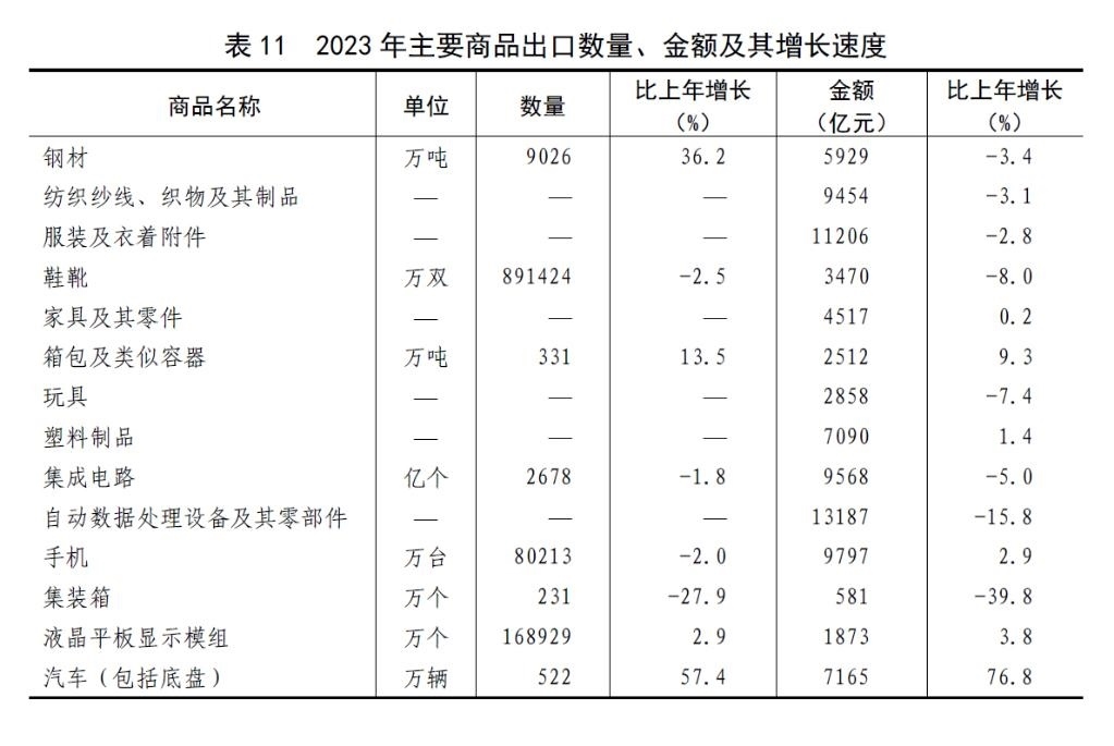 全年貨物進(jìn)出口總額417568億元,比上年增長0.2%。其中,出口237726億元,增長0.6%;進(jìn)口179842億元,下降0.3%。貨物進(jìn)出口順差57883億元,比上年增加1938億元。對共建“一帶一路”[46]國家進(jìn)出口額194719億元,比上年增長2.8%。其中,出口107314億元,增長6.9%;進(jìn)口87405億元,下降1.9%。對《區(qū)域全面經(jīng)濟(jì)伙伴關(guān)系協(xié)定》(RCEP)其他成員國[47]進(jìn)出口額125967億元,比上年下降1.6%。民營企業(yè)進(jìn)出口額223601億元,比上年增長6.3%,占進(jìn)出口總額比重為53.5%。