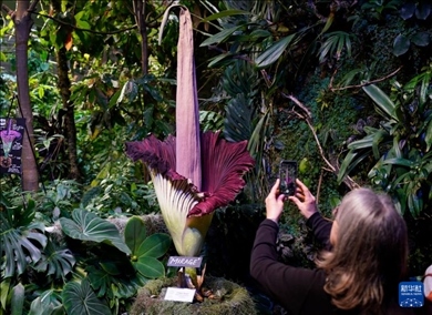 美國舊金山加州科學(xué)博物館內(nèi)一株開花的巨魔芋吸引大批游客觀賞。巨魔芋原產(chǎn)于印度尼西亞蘇門答臘島的熱帶雨林,每隔7至10年開花一次,每次開花時(shí)間只有24至36個(gè)小時(shí)。