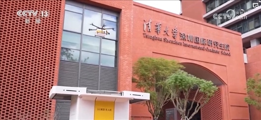 在深圳的一所大學,一架無人機降落在外賣柜上方,通過精準定位系統(tǒng)將外賣投入柜中。