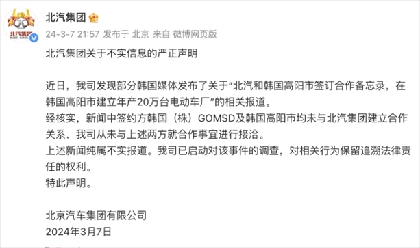 ·北汽集團(tuán)聲明:“在韓國高陽建廠”信息不實(shí)。
