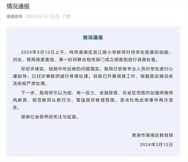 ·廣西通報“小學(xué)教師扇打拖拽學(xué)生”:屬實(shí),對涉事教師停課處理。