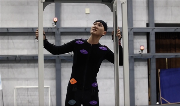 動(dòng)捕演員身著特定裝備在動(dòng)捕棚內(nèi)表演。新華社發(fā)