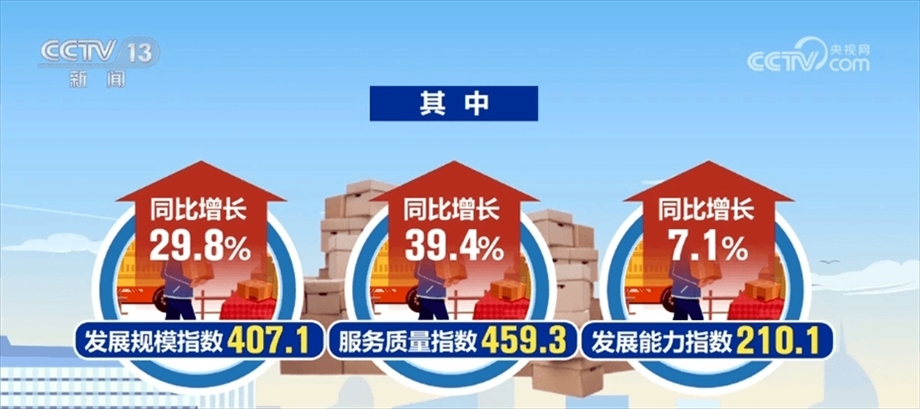 數(shù)據(jù)顯示,2024年1—2月中國快遞發(fā)展指數(shù)為329.6,同比提升26.7%。其中,發(fā)展規(guī)模指數(shù)、服務(wù)質(zhì)量指數(shù)和發(fā)展能力指數(shù)同比分別增長(zhǎng)29.8%、39.4%、7.1%,發(fā)展趨勢(shì)指數(shù)為66。
