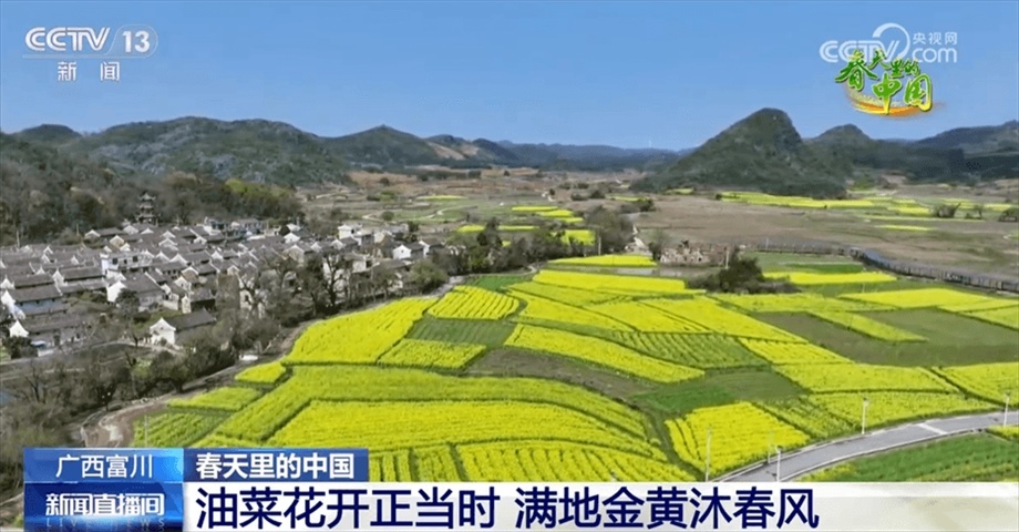 現(xiàn)在我們看到的是廣西富川瑤族自治縣的四萬多畝油菜。眼下,春意正濃,油菜進(jìn)入盛花期,明艷的金黃色成了春日主色調(diào)。油菜花次第開放,清風(fēng)微拂,淡淡花香沁人心脾,花海與山巒、古村勾勒出一幅田園春景圖,吸引不少游客前來賞花踏青,感受春天的氣息。