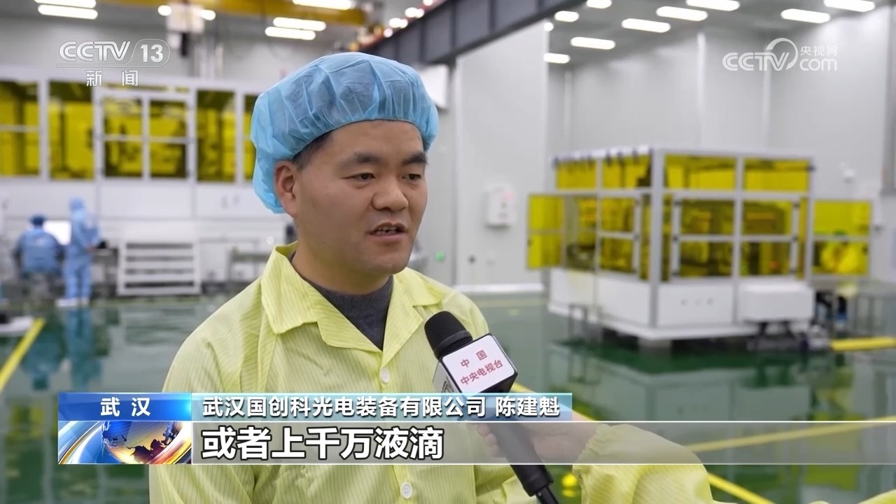 武漢國創(chuàng)科光電裝備有限公司陳建魁介紹,叫做噴墨打印的技術(shù),像我們一個手機屏,一個屏幕上就需要幾百萬個像素點,對應(yīng)的,如果打印的時候,可能會需要幾百萬或者上千萬液滴。