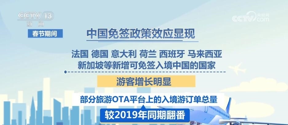 根據(jù)國家移民局統(tǒng)計數(shù)據(jù),2024年1月至2月,外籍人員入出境共計294.5萬人次,環(huán)比增長2.3倍,恢復(fù)至疫情前的41.5%。春節(jié)期間,中國免簽政策效應(yīng)顯現(xiàn),法國、德國、意大利、荷蘭、西班牙、馬來西亞、新加坡等新增可免簽入境中國的國家,游客增長明顯,部分旅游OTA平臺上的入境游訂單總量較2019年同期翻番。