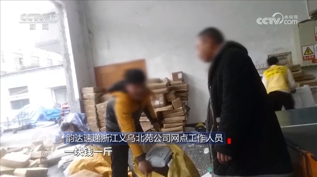 那么,涉事公司的快遞網(wǎng)點到底存不存在這種情況呢?記者進行了實地探訪。在快遞網(wǎng)點的退件區(qū),現(xiàn)場有穿著“北苑韻達”字樣服裝的工作人員正在作業(yè)。工作人員告訴記者,退件用車?yán)?,一元錢一斤賣掉。