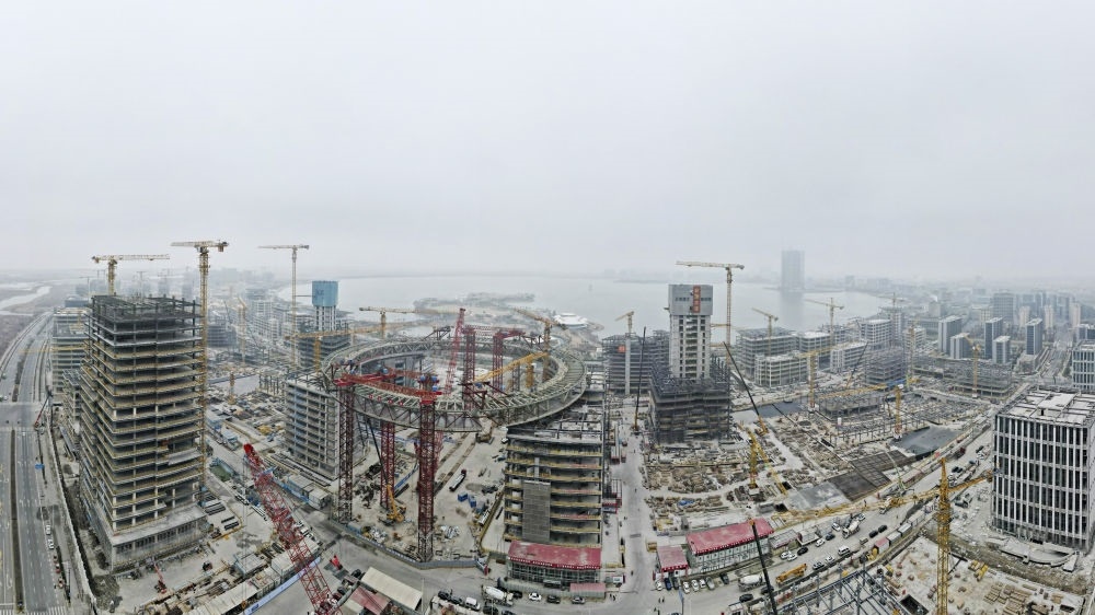 空中俯瞰建設(shè)中的上海臨港新片區(qū)滴水湖金融灣項目(2024年1月18日攝,無人機(jī)全景照片)。新華社記者 方喆 攝