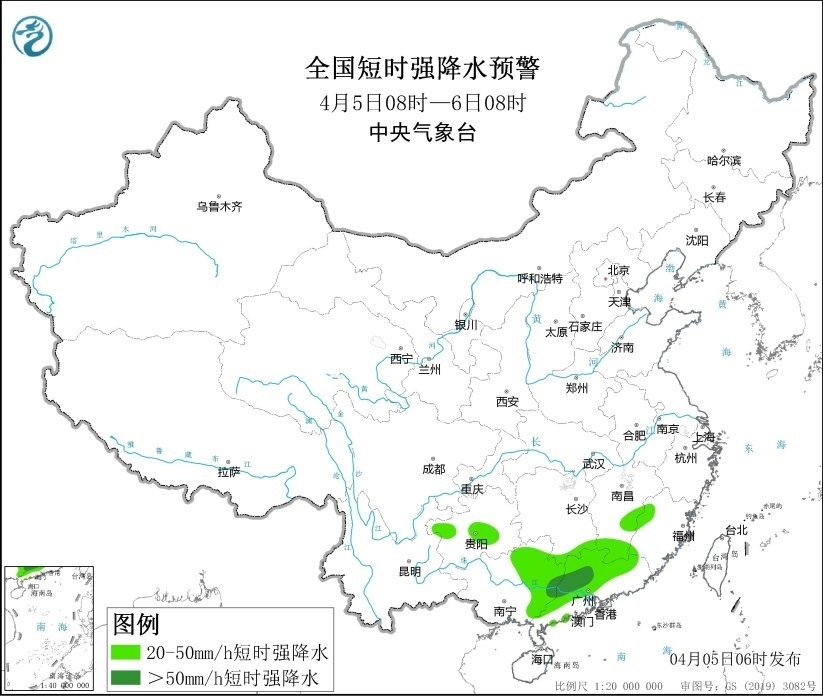 央視網(wǎng)消息:中央氣象臺(tái)4月5日06時(shí)發(fā)布強(qiáng)對(duì)流天氣藍(lán)色預(yù)警。預(yù)計(jì)4月5日08時(shí)至6日08時(shí),江西南部、廣西東部、廣東中西部和北部等地的部分地區(qū)將有8級(jí)以上雷暴大風(fēng)或冰雹天氣;其中,廣西東北部、廣東中西部和北部等地的局地將有10級(jí)以上雷暴大風(fēng);另外,湖南南部、江西南部、福建西部、貴州西北部和中部、廣西東部、廣東中西部和北部等地的部分地區(qū)將有小時(shí)雨量大于20毫米的短時(shí)強(qiáng)降水天氣;其中,廣西東部和廣東中西部等地的局地最大小時(shí)雨量大于50毫米,個(gè)別地方可達(dá)80毫米以上。
