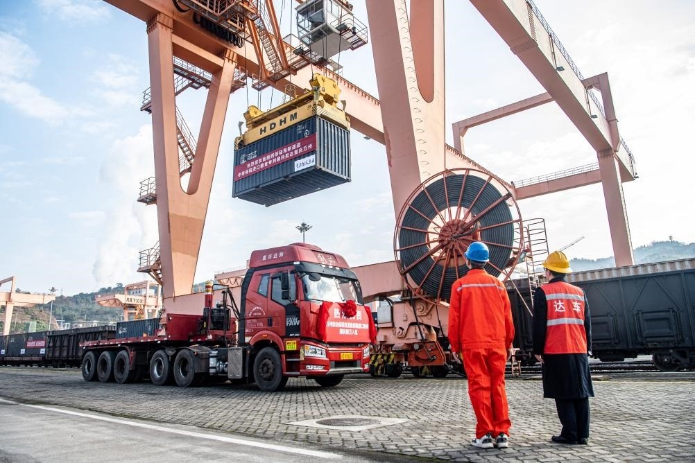3月7日,一列滿載機(jī)械設(shè)備、整車及零部件等貨物的中歐班列在重慶團(tuán)結(jié)村中心站等候發(fā)車。新華社記者 黃偉 攝