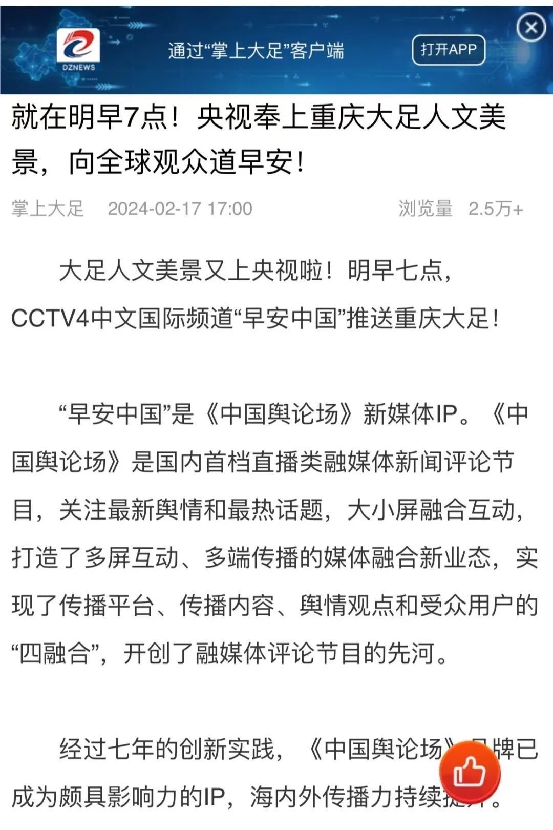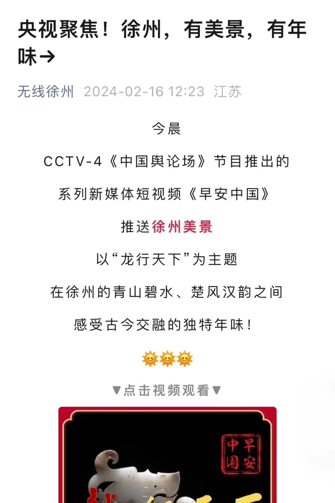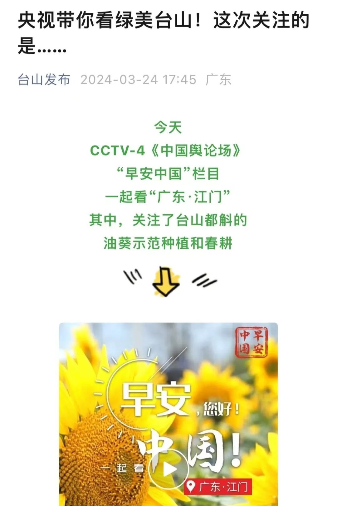 “央視帶你看綠美臺山,這次關(guān)注的是......”“就在明早7點(diǎn)!央視奉上重慶大足人文美景,向全球觀眾道早安!”“央視聚焦!徐州,有美景,有年味”“金葵向陽開,中春好景和風(fēng)裁!美麗江門與您相遇央視《早安中國》”……越來越多的地方政府伸出橄欖枝,希望《早安中國》多“來”當(dāng)?shù)匾挥[好風(fēng)光。