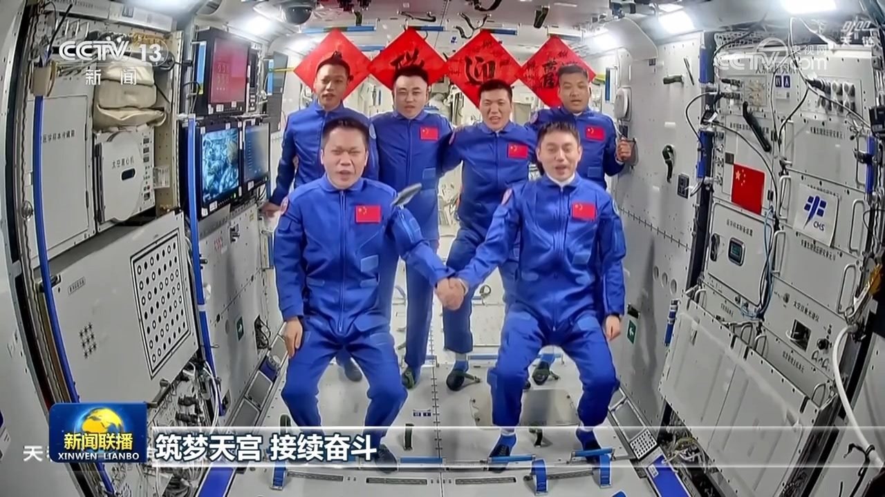 隨后,兩個(gè)航天員乘組拍下“全家?!?,共同向牽掛他們的全國人民報(bào)平安。