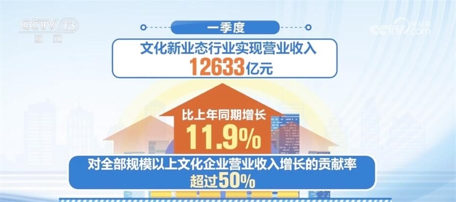 文化新業(yè)態(tài)行業(yè)持續(xù)發(fā)揮帶動效應,一季度,文化新業(yè)態(tài)行業(yè)實現(xiàn)營業(yè)收入12633億元,比上年同期增長11.9%,對全部規(guī)模以上文化企業(yè)營業(yè)收入增長的貢獻率超過50%。