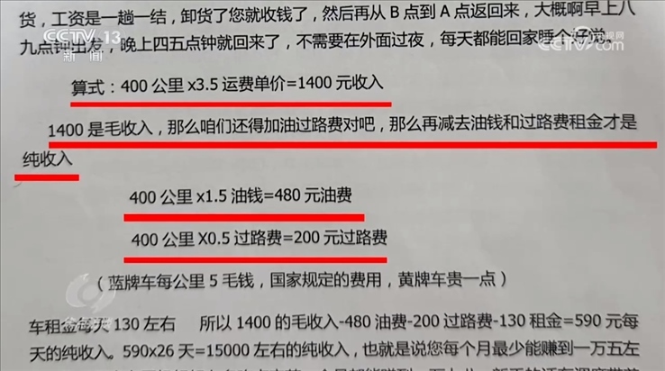 這些公司在和司機(jī)簽約時(shí),根據(jù)司機(jī)個(gè)人情況的不同,對(duì)他們收取幾千元到幾萬(wàn)元不等的費(fèi)用。還沒(méi)掙錢就先交錢,而且交的還不少,司機(jī)們?yōu)槭裁磿?huì)心甘情愿地交這些錢呢?因?yàn)槊嬖嚂r(shí),公司給司機(jī)們?cè)敿?xì)算過(guò)他們的收入。