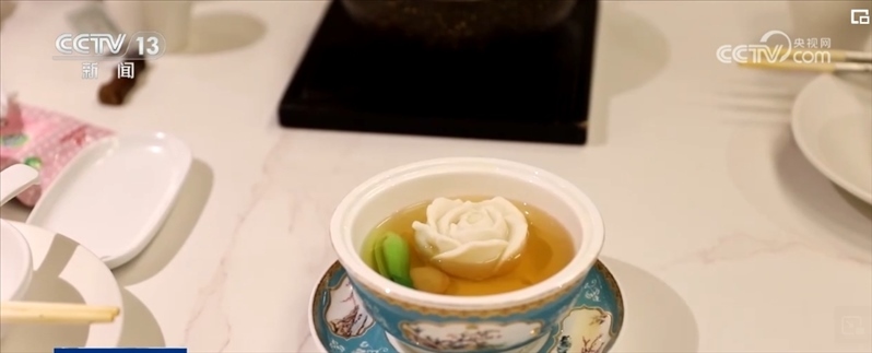 不僅僅是氛圍的打造,菜品創(chuàng)意也在還原原著中十二道菜品的基礎(chǔ)上,再對(duì)其進(jìn)行創(chuàng)新和延伸, “可卿山藥棗泥糕”“鳳姐火腿肘子”“寶釵胭脂鵝”等獨(dú)具紅樓特色的菜品,都可以在這里吃到。這朵以假亂真的花朵是這里的一道招牌菜,由魚茸制作而成的“黛玉傳花”,來自上海的房阿姨對(duì)這道菜尤為喜愛。