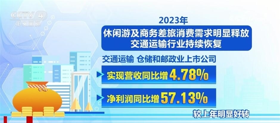 2023年,休閑游及商務(wù)差旅消費(fèi)需求明顯釋放,交通運(yùn)輸行業(yè)持續(xù)恢復(fù),交通運(yùn)輸、倉儲(chǔ)和郵政業(yè)上市公司實(shí)現(xiàn)營收、凈利潤同比增4.78%、57.13%,較上年明顯好轉(zhuǎn)。