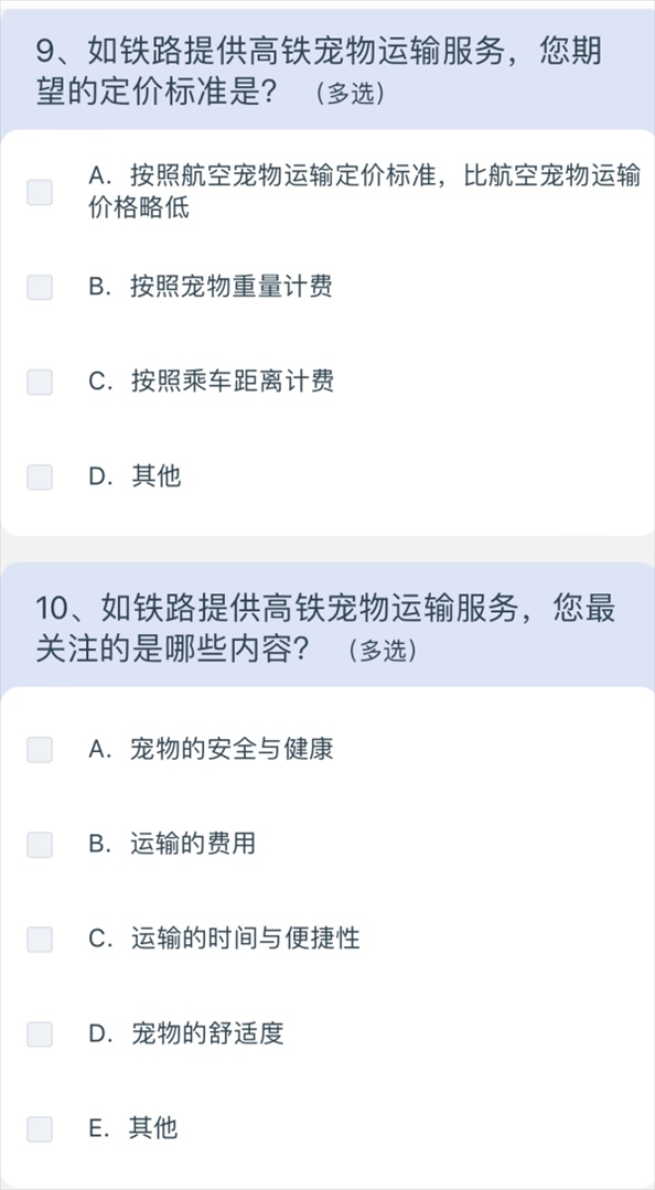 5月10日上午8點(diǎn)40分,澎湃新聞?dòng)浾咄ㄟ^(guò)掃描網(wǎng)友分享的列車上的二維碼,進(jìn)入12306系統(tǒng),選擇問卷·建議,進(jìn)入“鐵路旅客高鐵寵物運(yùn)輸”調(diào)查,共15個(gè)問題,涉及養(yǎng)寵類型、是否有攜帶寵物出行的需求、如果鐵路提供寵物運(yùn)輸服務(wù)是否愿意嘗試等,以及為降低對(duì)其他旅客的影響,在高鐵寵物運(yùn)輸更關(guān)注哪方面的防護(hù);如鐵路提供高鐵寵物運(yùn)輸服務(wù),期望的定價(jià)標(biāo)準(zhǔn);如鐵路提供高鐵寵物運(yùn)輸服務(wù),最關(guān)注的內(nèi)容;如果是非養(yǎng)寵人士,對(duì)高鐵寵物運(yùn)輸有何建議等多方面問題。
