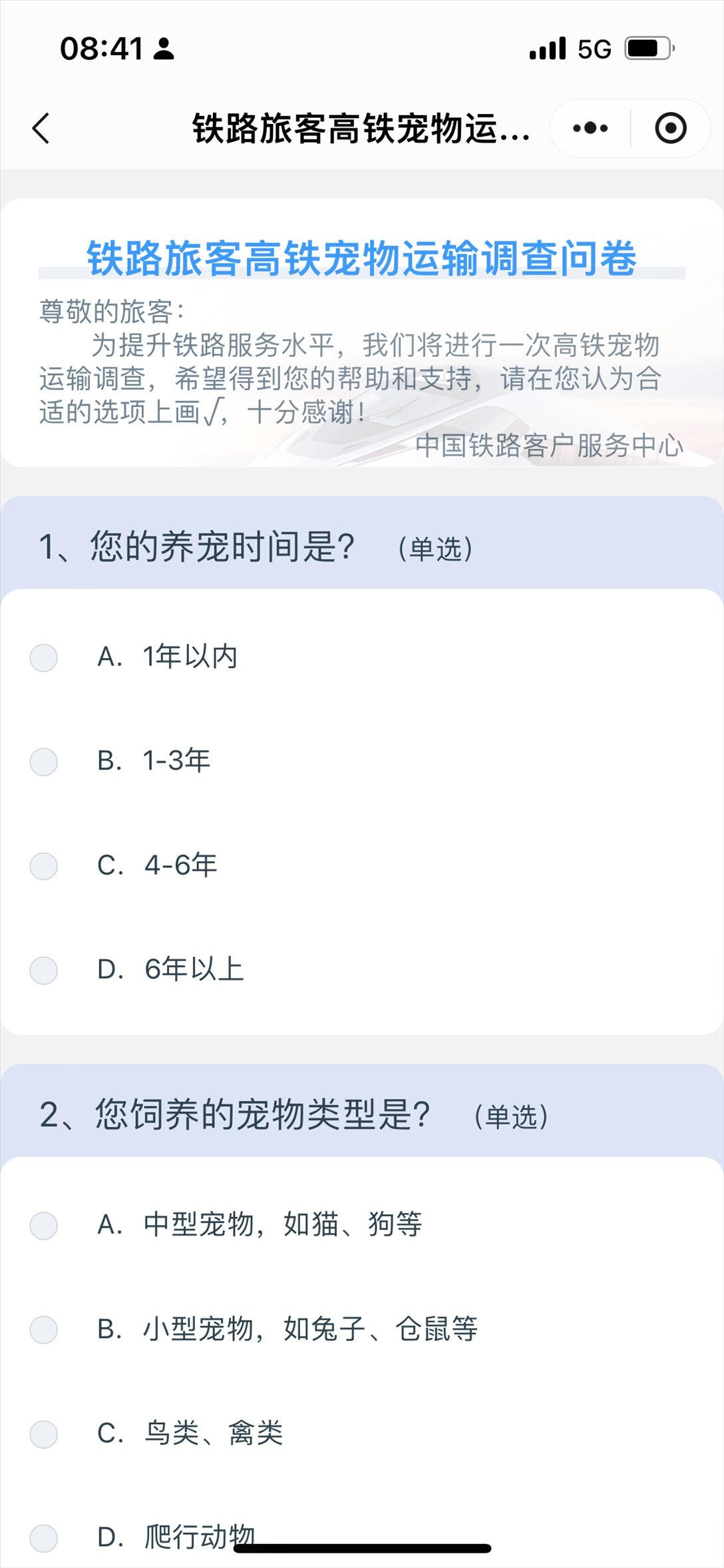 中國(guó)鐵路客戶服務(wù)中心推出高鐵寵物運(yùn)輸調(diào)查問卷。 截屏圖