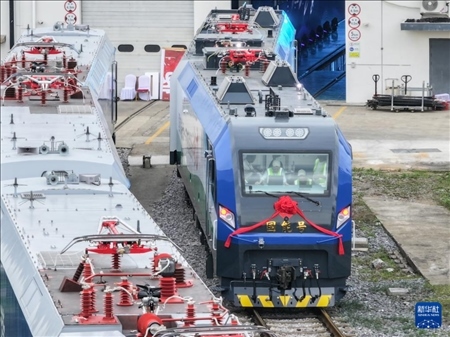 國(guó)內(nèi)首臺(tái)新型智能重載電力機(jī)車在湖南株洲下線。