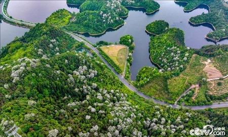 初夏時(shí)節(jié),浙江杭州,千島湖畔山坡上大片的桐花綻放,形成了五月“十里飛雪”的景觀,美不勝收。
