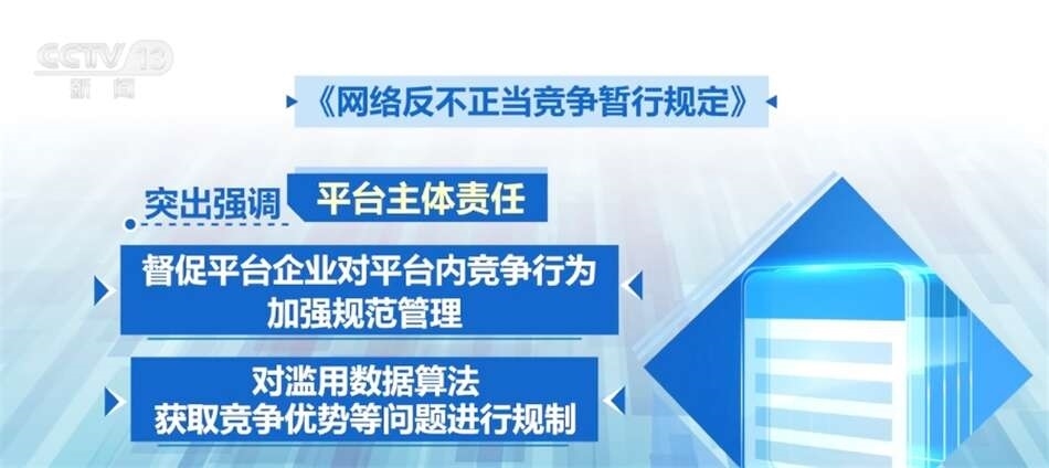平臺企業(yè)掌握海量數(shù)據(jù),連接大量主體,既是網(wǎng)絡(luò)不正當(dāng)競爭監(jiān)管的重點(diǎn)對象,也是協(xié)同監(jiān)管的關(guān)鍵節(jié)點(diǎn)?!兑?guī)定》突出強(qiáng)調(diào)了平臺主體責(zé)任,督促平臺企業(yè)對平臺內(nèi)競爭行為加強(qiáng)規(guī)范管理,同時對濫用數(shù)據(jù)算法獲取競爭優(yōu)勢等問題進(jìn)行規(guī)制。