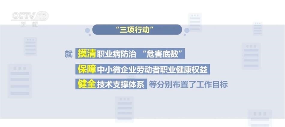 “三項(xiàng)行動”工作方案包括《職業(yè)病危害項(xiàng)目申報擴(kuò)面行動(2024—2025年)工作方案》《中小微企業(yè)職業(yè)健康幫扶行動(2024—2025年)工作方案》《職業(yè)病防治機(jī)構(gòu)提質(zhì)合規(guī)行動(2024—2025年)工作方案》。