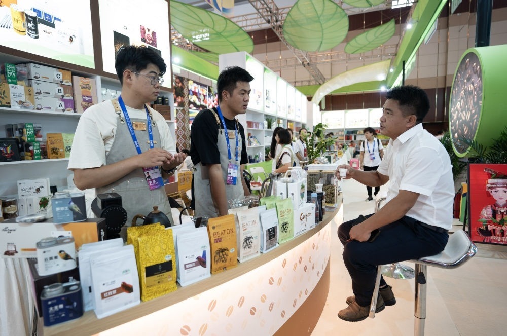 來自云南保山的參展商在第七屆中國(guó)—南亞博覽會(huì)上向參觀者介紹咖啡產(chǎn)品(2023年8月16日攝)。新華社記者 陳欣波 攝
