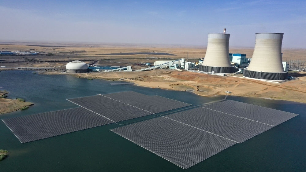 國(guó)家能源集團(tuán)寧夏電力公司寧東電廠3×5.98兆瓦漂浮分布式光伏發(fā)電項(xiàng)目全景(無人機(jī)照片,2022年6月17日攝)。新華社記者 王鵬 攝